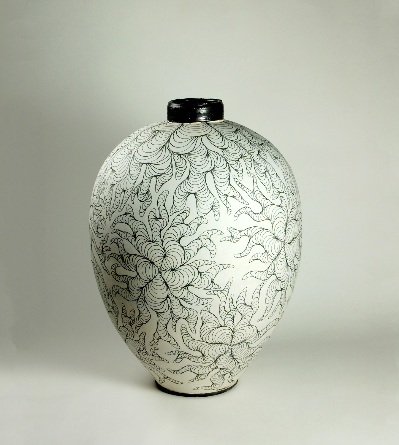Alistair Danhieux s’est fait connaître au début des années 2000 et plus particulièrement lors de sa première exposition personnelle à la Galerie de l’Ancienne Poste en 2009 où il présentait ses œuvres en « raku nu » qui ont fait sa renommée. Cependant, Alistair n’est pas de ces créateurs qui s’installent confortablement dans une production à succès pour n’en plus dévier. Après une incursion vers des formes sculpturales en grès, l’artiste commence à explorer vers 2014 les cuissons de haute température, utilisant dès lors le grès et la porcelaine qui lui fournit la toile blanche pour renouer avec un décor très graphique, toujours noir sur blanc, appliqué au pinceau, sur des formes de vases, souvent fermées par des couvercles de bois taillé.