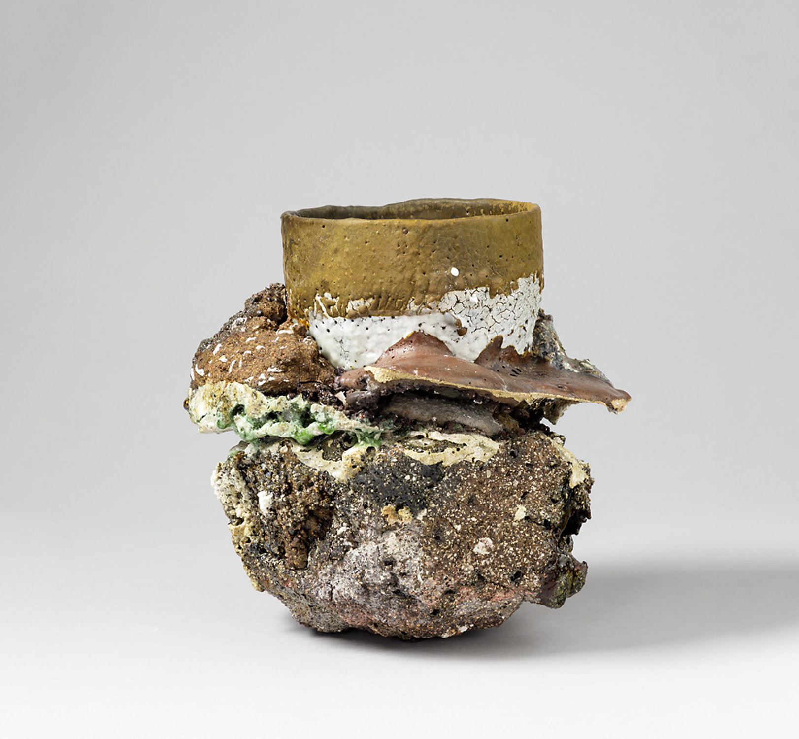 Il y a les bols finis et les bols en naissance. Mais contrairement à ce qui devrait être, il y a manipulation de la chronologie. Dès le début — années 70 — j’ai fait des bols “finis”, normaux, se labélisant du bol raku japonais traditionnel et notoirement zen, sans complexe donc. À cette époque, en 1979 précisément, j’intitulai un article de revue, “le monde dans un bol”, sans complexe là non plus… Puis vinrent, dans les années 2000, les bols-genèse, un retour en arrière, le retour aux vraies origines, le bol comme roche creusée réceptive, le bol premier émergeant : fabriqués et bricolés àpartir de bols “finis ratés”, broyés, concassés, ressoudés pour faire du nouveau avec de l’ancien — ce qui est encore ma préoccupation actuelle —, c’est donc revenir à un point de départ et être accidentellement à la mode recyclage. Mais pour rester confiné dans un univers céramique, donc sensible plus qu’intelligible et raisonnable, les bols-genèse apparaissent dans un environnement sédimentaire où les actions rituelles successives donnent matière à des strates différenciées mais qui se parlent, s’interfèrent ou se contredisent. Le tout ensuite, transfiguré, figé, bousculé par ces périodes volcaniques que sont les cuissons, multipliées, répétées souvent comme des hoquets de volcan. Quant aux “bols finis” d’aujourd’hui, ils s’apparentent à la fois à des abstractions de bols usuels et à des images manipulables, sortes de monotypes ayant un recto et un verso, une face et un dos, des lèvres, une panse et un pied, donc des êtres qui nous ressemblent un peu, un peu comme les bols qu’Onisaburo façonnait en fixant son modèle vivant, dit-on.