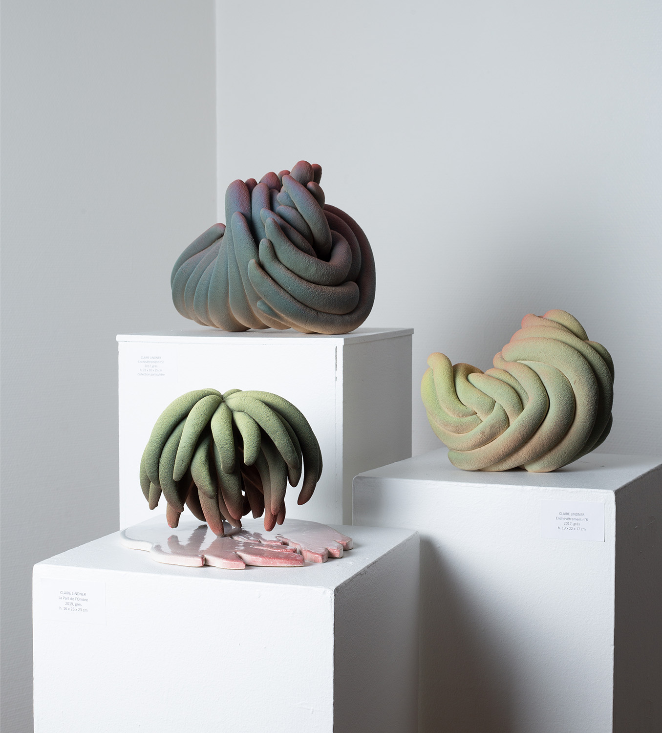 Claire Lindner assemble des colombins évoquant un univers organique, végétal ou sous-marin. Douceur, étrangeté et apparente souplesse s’expriment sous une surface granuleuse et dans des couleurs tranchées appliquées au pistolet.
