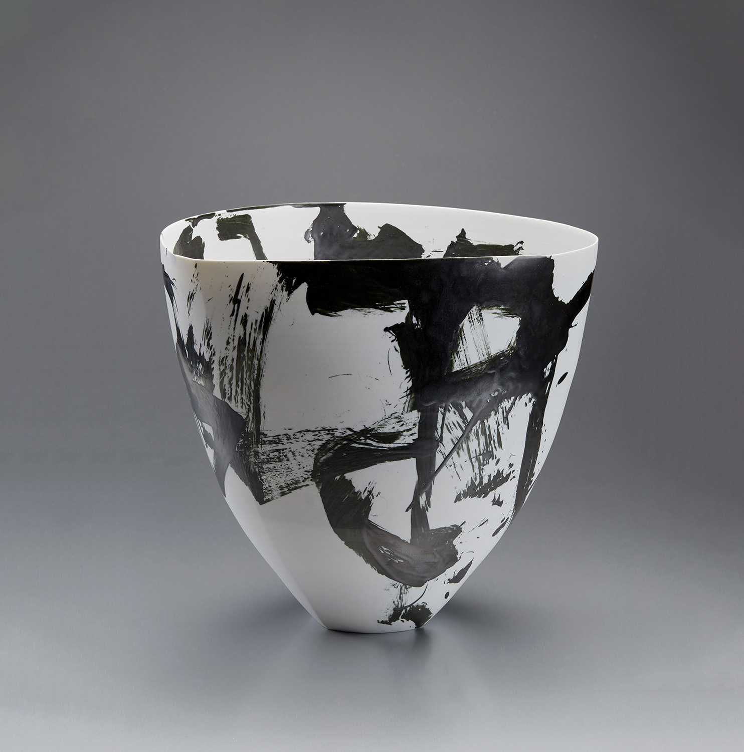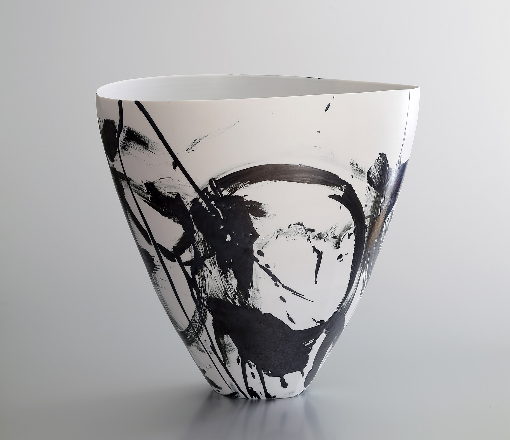 L’exposition à la Galerie de l’Ancienne Poste met l’accent sur d’étroites formes hautes et de larges cylindres de porcelaine blanche sur lesquels Karin Bablok développe ce décor d’émail noir, posé spontanément au pinceau, qui est devenu au fil des années caractéristique de son expression personnelle – la préoccupation principale de l’artiste étant de chercher des harmonies entre les interventions noires qui jouent à l’intérieur et à l’extérieur des pièces. Karin Bablok réagit en effet d’une façon intuitive aux contours des volumes créés. Prenant comme guide les dimensions de chaque pièce, elle parcourt la surface en nouant des liens. Comme dans un pas de deux, peinture et objet s’unissent et captent avec justesse ce moment fugitif où s’installe l’équilibre.