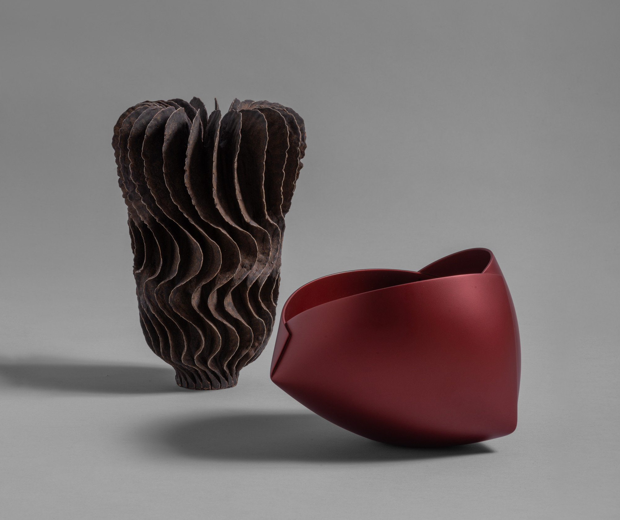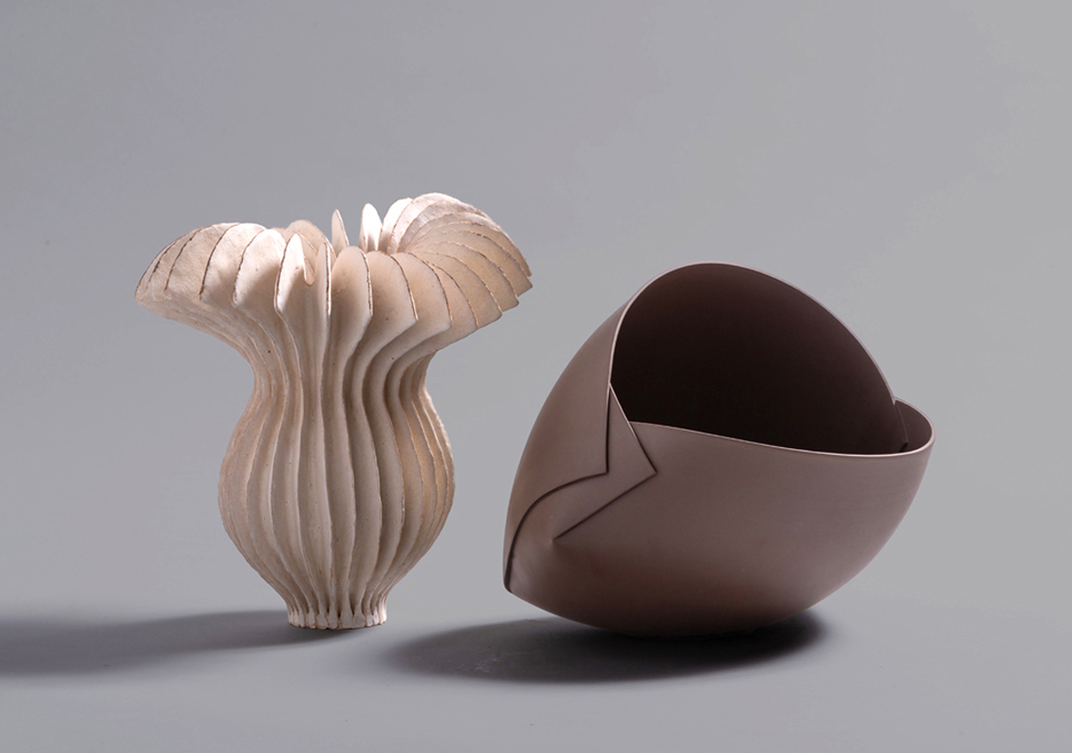 Depuis leurs dernières expositions personnelles à la galerie de l’Ancienne Poste, respectivement en 2016 et en 2017, Ursula Morley-Price et Ann Van Hoey ont continué à faire évoluer leur travail, sans rien perdre de ce qui fait leur singularité. Au fil du temps, l’une et l’autre ont forgé et développé un style immédiatement reconnaissable, dont elles ne se départissent pas. La première produit des pièces en grès aux formes ouvertes, évasées, prolongées de délicates ailettes qui partent du corps principal de la structure pour se développer dans l’espace, la seconde poursuit son travail de découpe, d’incision et de pliage de plaques d’argile, pour donner naissance à une déclinaison d’objets très design, inspirés de formes simples, demi-sphère, triangle ou carré.